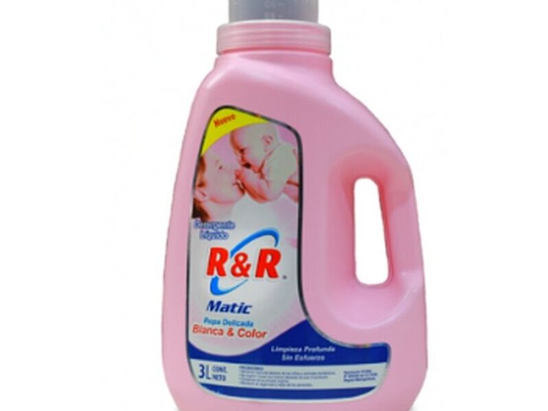 Detergente líquido concentrado RyR 3 litros, especial para ropa delicada y de bebé. Puede ser utilizado en todo tipo de ropa (blanca, oscura o color). Apto para lavadora automática y manual.