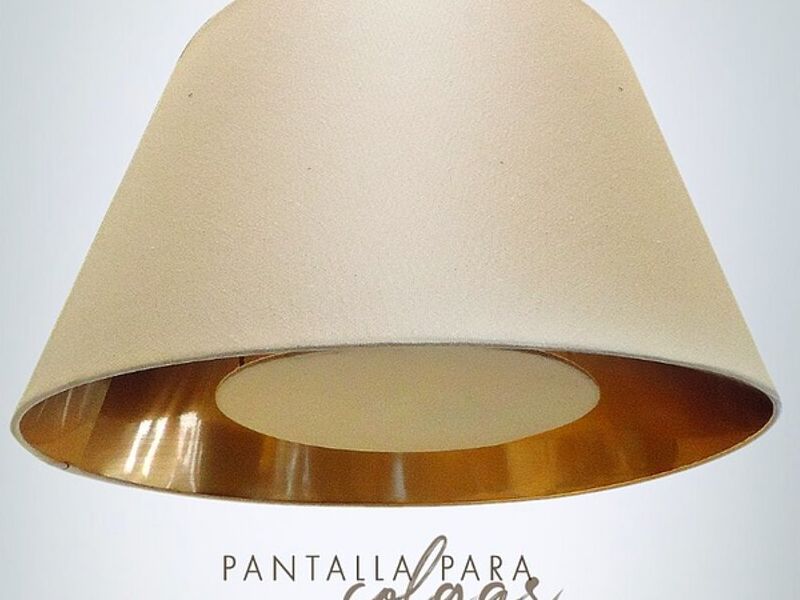 Pantalla para colgar con interior dorado, y tapa difusora. Ideal para living o comedor, medidas: 40cm diámetro superior x 55cm diámetro inferior x 30cm de alto
