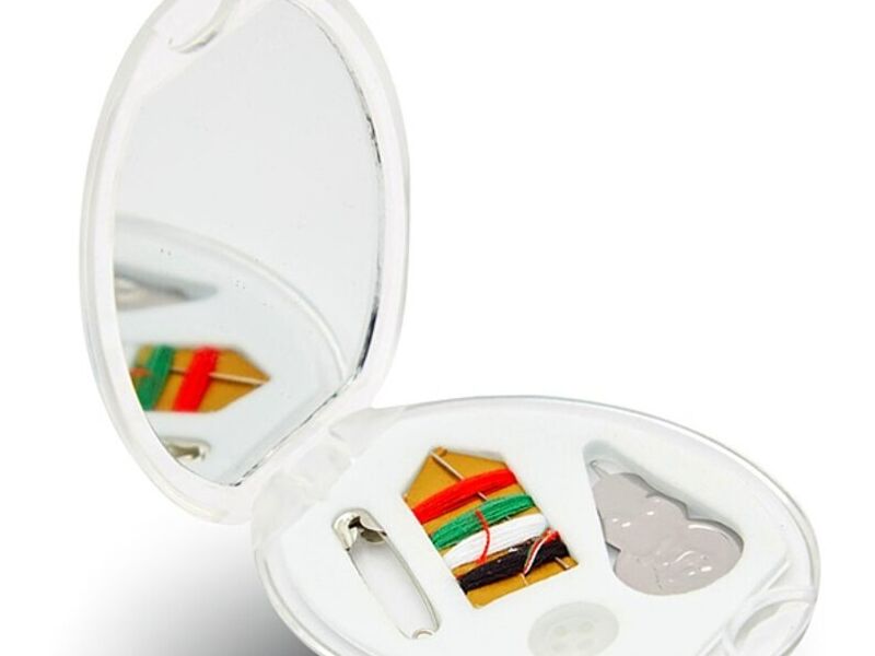 Mini costurero de viaje de plástico Incluye: Espejo, aguja con 4 tonos de hilo, botón y alfiler de gancho.