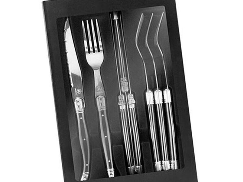 Set de 8 cubiertos, incluye 4 cuchillos y 4 tenedores. Hojas de acero forjado 420 y mango ABS con detalles metálicos.