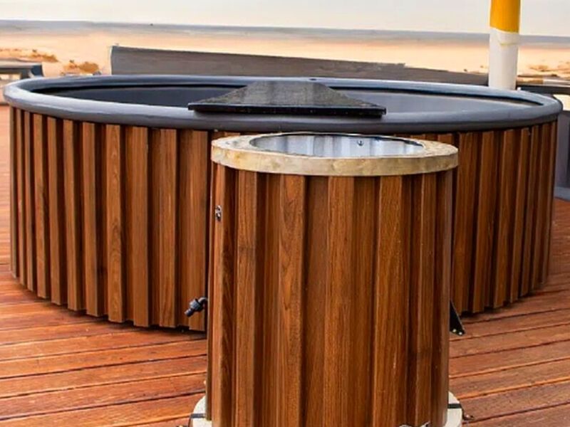 Tina para 6 adultos, fabricación en plástico reciclado y metal libre de mantención y fácil de limpiar.