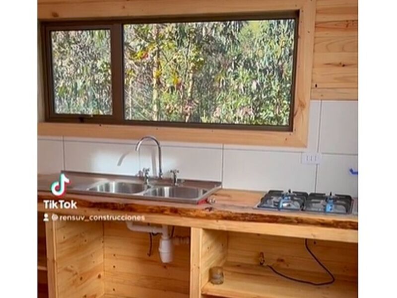 La cocina es moderna con toques rústicos, como gabinetes de madera, encimeras de granito y una isla central proporciona espacio adicional.