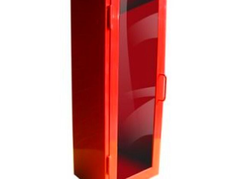 Gabinete de color rojo estándar, fabricado en lámina metálica de acero carbono, para albergar extintores contra incendio de 2, 4, 6 y 10 kg. Posee puerta vidriada sellada con silicona, marco metálico, bisagra pomel, junquillos metálicos, cierre a presión, y puerta abatible en 180º. Pintura termo convertible epóxico, 90 micras en doble capa. Puede solicitarse para más de un extintor, de acuerdo a las necesidades del cliente.