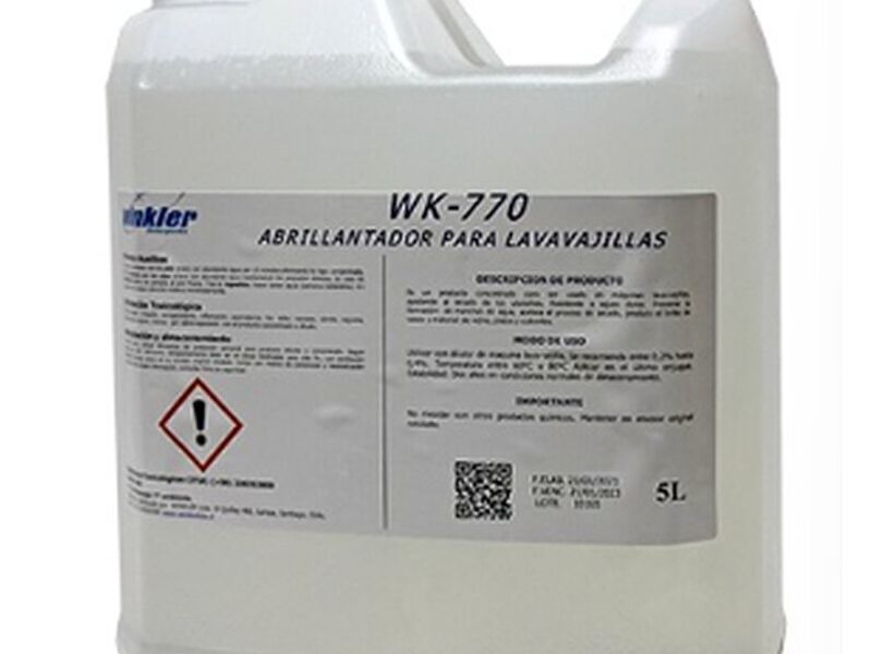 WK-770 es un producto concentrado para ser usado en máquinas lava-vajillas y platos, ayudando al secado de los utensilios. Resistente a aguas duras. Previene la formación de manchas de agua, acelera el proceso de secado, produce el brillo de vasos y material de vidrio, platos y cubiertos.