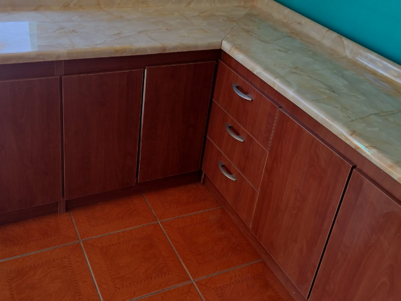 Un mueble de cocina en forma de "L" es un tipo de diseño que aprovecha eficientemente las esquinas de la cocina. Consiste en dos secciones de gabinetes y estantes que se unen en ángulo recto para formar una forma de "L". Este diseño maximiza el espacio de almacenamiento y trabajo en la cocina, proporcionando una distribución funcional y organizada para utensilios, ollas, alimentos y otros elementos. Es una opción popular para cocinas pequeñas o medianas, ya que permite una disposición eficiente de los muebles y facilita el movimiento alrededor de la cocina.