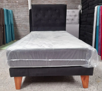 Cama de estructura tapizada en gris oscuro, perfecta para un dormitorio moderno.