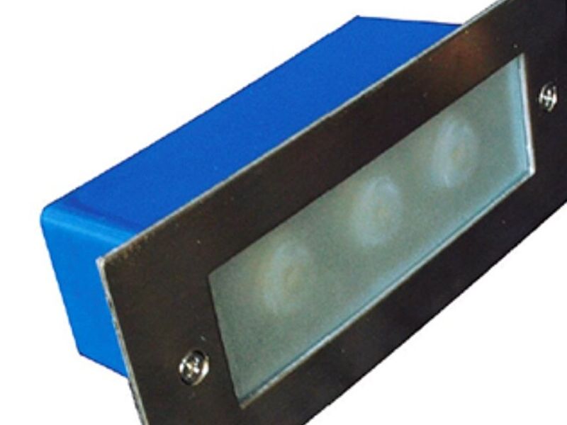 Luminaria LED empotrada en muro, cubierta externa de PVC, cuerpo de aluminio de fundición, marco de acero inoxidable y lente de vidrio, uso interior/exterior. IP65
