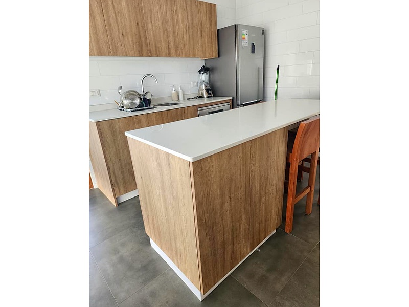 Mesón de cuarzo blanco, elegante y duradero, perfecto para añadir un toque contemporáneo a tu cocina o baño con facilidad de mantenimiento.