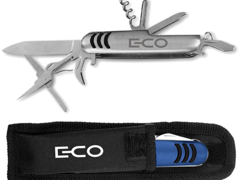 Navaja multifuncional. Incluye: desarmador, destapador, abrelatas, tijeras, sacacorchos y arillo para llavero. Incluye funda. Presentación: caja en color plateado.
