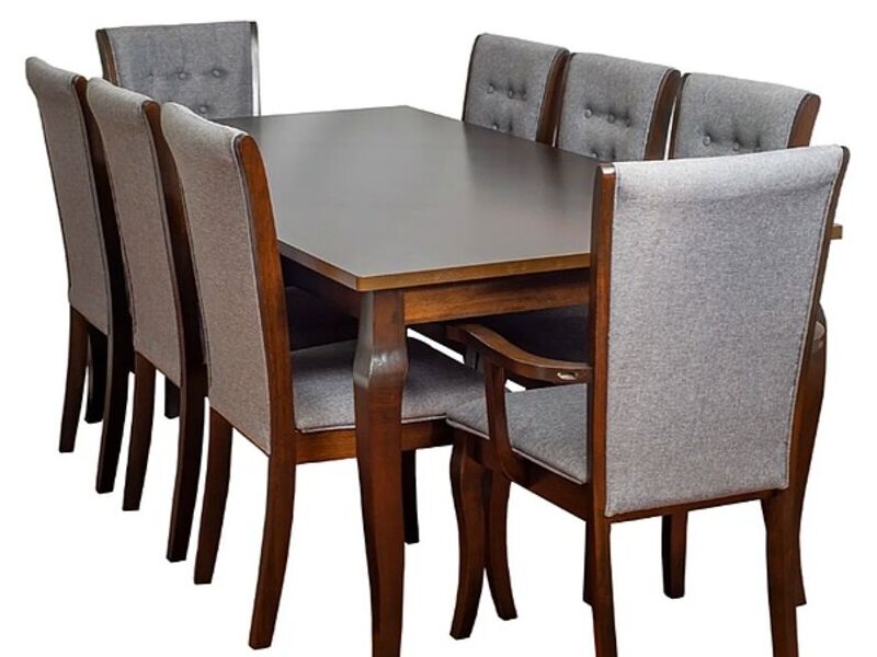 Hermoso juego de comedor para 8 personas de madera color chocolate, con 6 sillas y 2 poltronas tipo comensales, de madera roble, de gran calidad y finas terminaciones. Este lindo comedor es importado directamente desde Malasia y fabricado con madera similar al roble chileno. comedor robusto, firme y estilo clásico con un toque moderno entregado por los botones de sus sillas.
