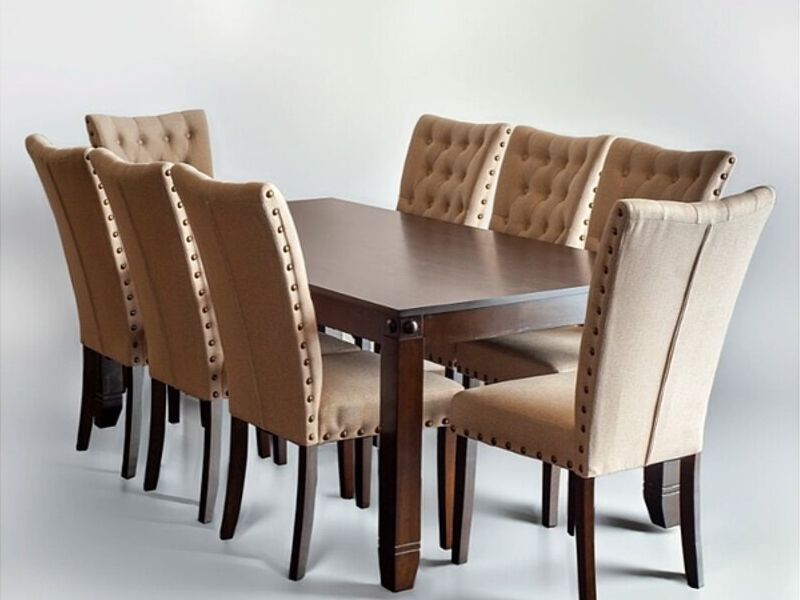 Hermoso comedor de madera en un clásico y estiloso color base chocolate con 8 cómodas y modernas sillas de diseño capitoné con tapiz de tela lino color beige. Comedor robusto, firme y de gran calidad fabricado en madera tipo roble originario de Malasia. Las sillas tienen hermosos detalles de tachas en sus bordes lo que las hacen destacar de otros diseños, además de una forma levemente curva en espalda que dará confort y comodidad al sentarse.