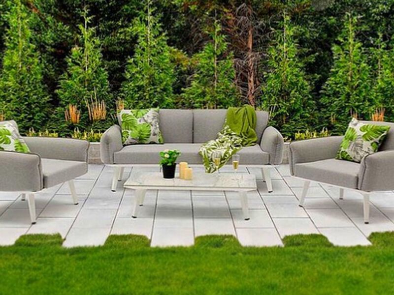 Set de terraza compuesto por 1 mesa de centro, 2 sillones y 1 sofá de 2 cuerpos. Sus materiales son estructura de aluminio color blanco, cubierta de la mesa de centro de cristal templado con film 3D porcelanato y cojines de tela para intemperie.
