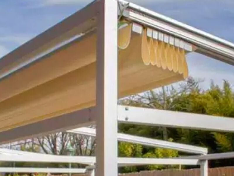 Esta pérgola retráctil tiene una lona en diseño ondulado logra evacuar las aguas lluvias al costado.