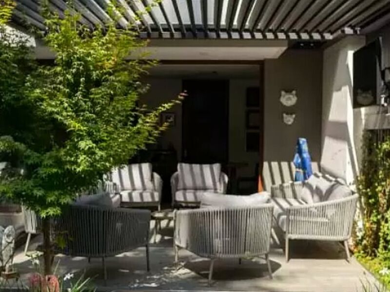 La pérgola bioclimática Spatio es un diseño propio y moderno de líneas minimalistas, fabricado en aluminio, con un sistema motorizado que permite cerrarse para proteger de la lluvia y abrirse para recibir luz y ventilar.