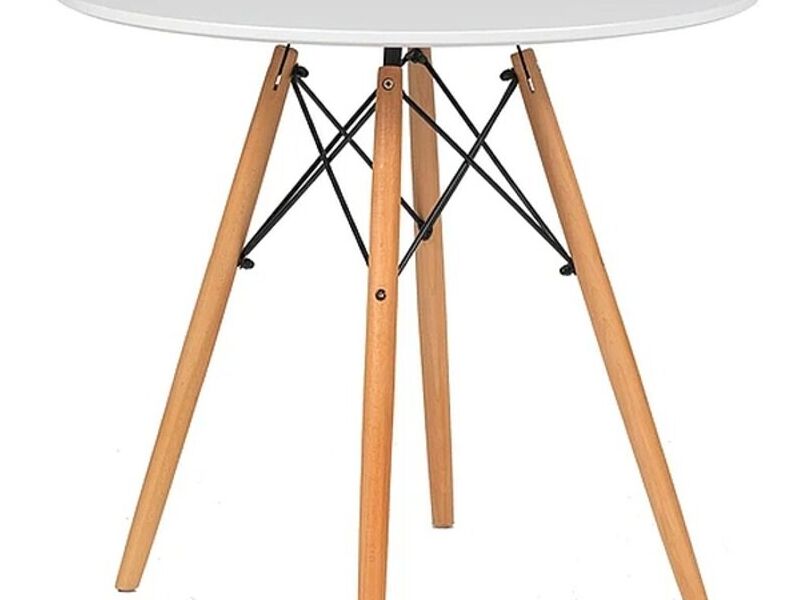 MESA REDONDA EAMS BLANCA 80 cms de diametro, cubierta fabricada en mdf lacado blanco y patas de madera, estructura metalica de sujecion electropintada negra