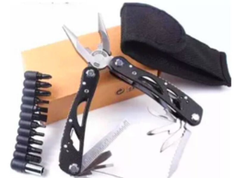Alicates cargados primavera, cortador de alambre y pelacables, plegables cuchillo de la lámina, cuchillo borde serrado, abrebotellas, archivos metal, destornilladores, de sierra de la cuchilla con dientes de cincel onduladas, la hoja de incisión. Alta calidad mini multiherramienta.