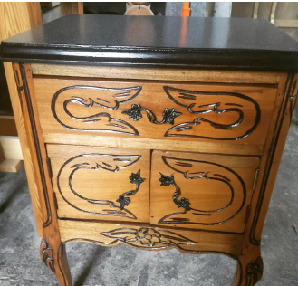 Cajonera de madera con detalles decorativos de estilo vintage.