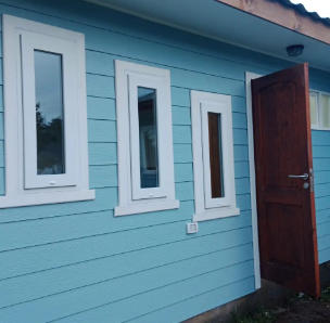Ventana de madera colocada en una fachada pintada de azul, ideal para casas modernas y cabañas.