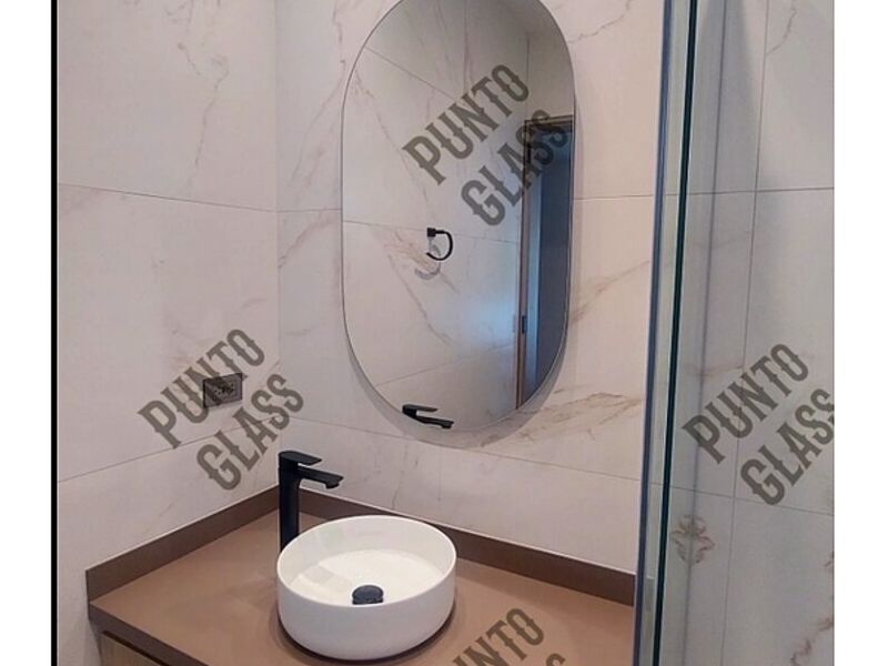 Espejo de vidrio semi redondo funcional y perfecto para estar frente un lavamanos.