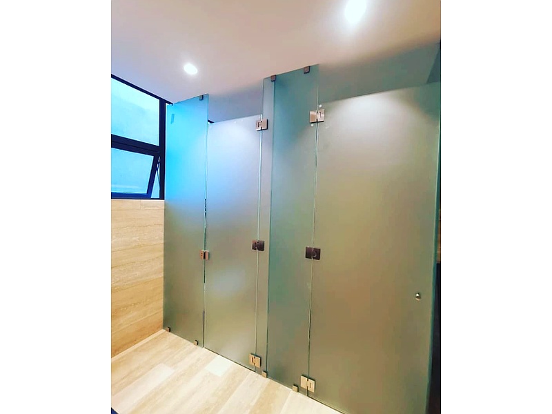 Provisión e instalación de shower door con cristal satén templado y herrajes de acero inoxidable.