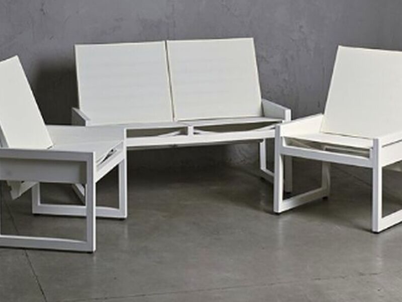 Conjunto de terraza conformado por un sofá mas dos sitiales, ambos cuentan con respaldos reclinables que permite ser usados como mesas laterales o de centro. Están fabricados con una estructura de aluminio en terminación blanco y tela sunbrella blanco.